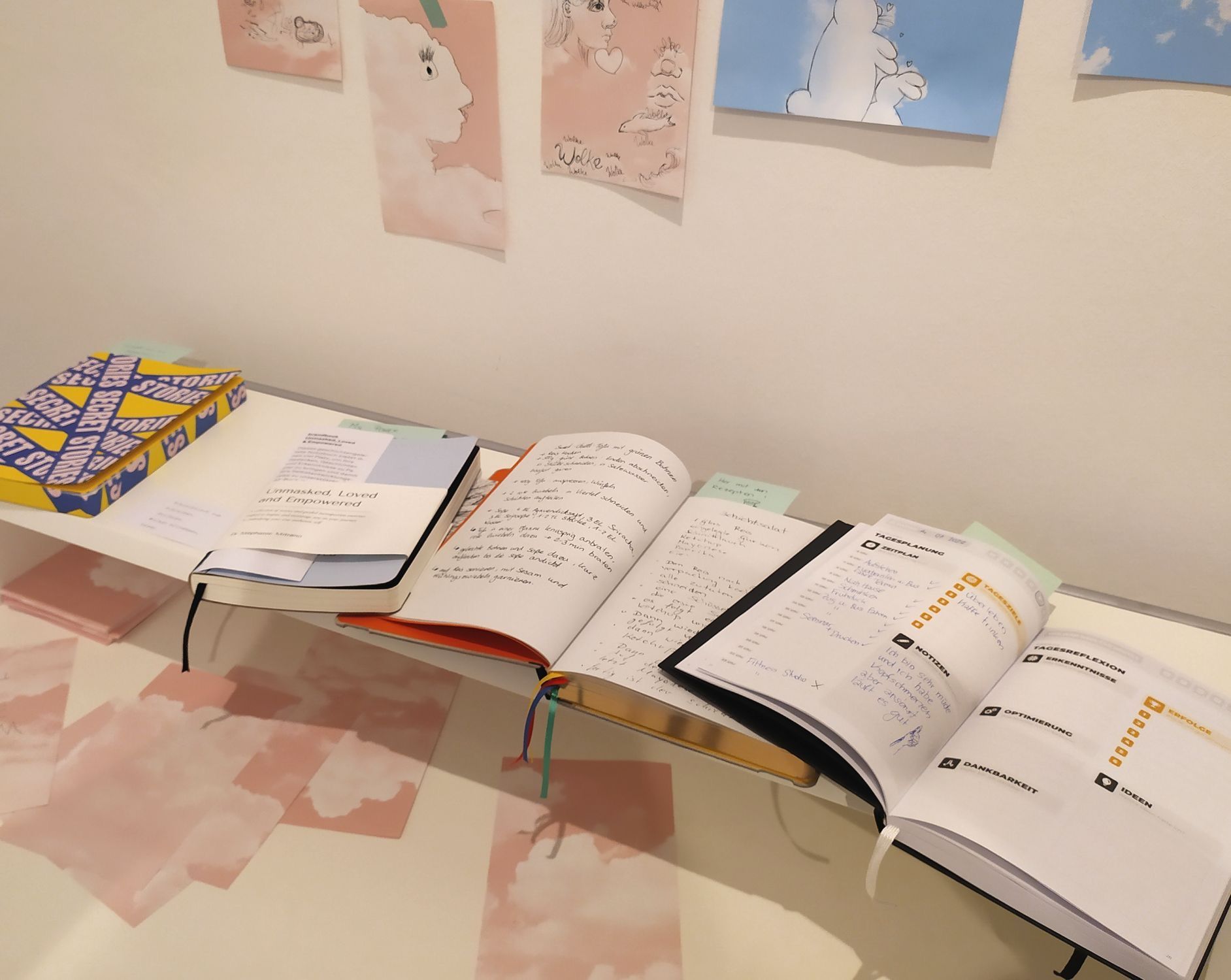 The Klingspor Museum exhibition about notebooks, diaries and bullet journal started ten days ago, and I look forward to discovering the various exhibits when I go visit in September. From the photos they sent me, we can see some interesting Japanese long papers of expressed thoughts, personal sketches to express ideas visually, various notebooks with colourful and personalized covers, and interactive exhibits where the visitors can also share their thoughts and stories.
